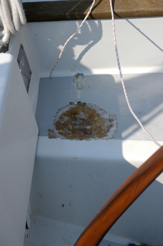 traveller was self supporting when it came to bridging the two seats. When the traveller was removed more rot was found on both seats. (I don't think anything on the boat was ever re-bedded) The rot was dug out and replaced with solid fibreglass with micro balloons. |