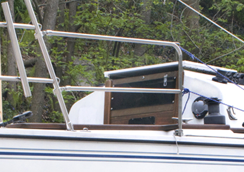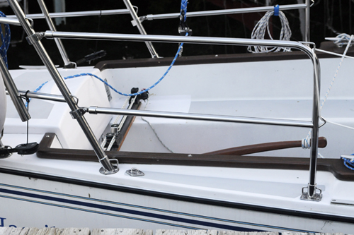 | Solid life lines to the first stanchion base. I am going to put netting around to keep the dog from becoming shark bait. The line attached now is just for planning the lifelines and is only temporary. |