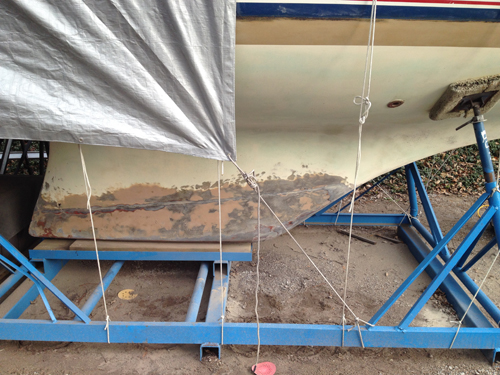 44 Years of bottom anti fouling was starting to add up. some places starting looking like the craters of the moon with all colors of the rainbow showing layer by layer. A number of us at the sailing club got together and had our boats sandblasted down to the Gel coat. Some of the boats has to have the blasting done past the gel coat due to blisters. No blisters on Lady Hamilton which goes to show the fiberglass techniques of the 60's and 70's wasn't that bad. I also have no spider cracks anywhere on deck. the only thing I will have to do is fill in some imperfections that look as if they were from the moulds. Looks like voids and bubbles from when the resin was off gassing. Probably laid up too fast and too thick and the heat built up causing the gassing. I have had the same problem when I rush some of my fiberglass jobs. You can see the lead and the light brown filler material used to fair the keel. Al in all I am very pleased. | |