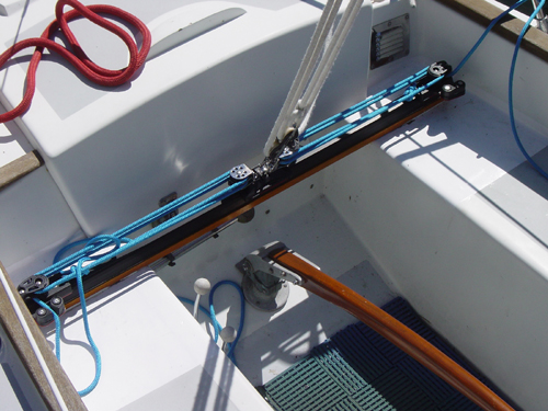 | The old traveller exploded one day while sailing as it was so old the plastic sheaves just gave out. the new Harken 4:1 windward sheeting car traveler was installed | ![]() |