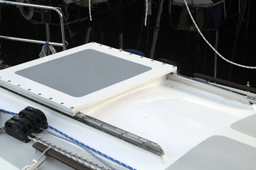I was going to do an acrylic hatch but the supplier screwed up the measurements twice and I needed a hatch to I made this one from epoxy coated plywood.  I copied the rails from and C&C and used starboard for the runners.  I built up the front part of the hatch and now I have a fairly waterproof, bug proof and stronger hatch.  The added benefit is the additional space at the sides allowed me to put two more clutches on each side and now I have all lines led back to the cockpit. There is teak trim on the top and bottom now.  I will update the picture when I have one.  Now thinking of making the hatch of 3/4 starboard with teak trim. (no painting, no worries)