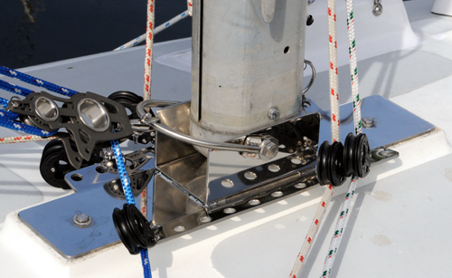 The mast was the old style shoe type and only had one halyard run back to the cockpit. I wanted to have a number of lines to the cockpit (but did not want to drill holes in the deck) so as to be able to single hand if need be.  Stainless Outfitters made this mast step from my drawings which turned out to be perfect.