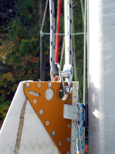 of the headboard and the mast sheave. With this shackle I am able to pull up and tension the main without the use of the winch most of the time (only needs a 1/2 turn on the winch when lazy) |