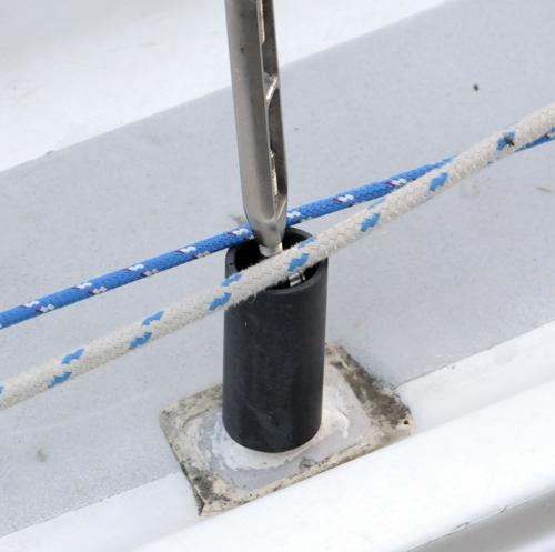 I made turnbuckle guards to prevent the lines from snagging. It was 4 inches of water pipe ( going to use white when I find some) I slit it lengthwise and slipped it over the shrouds. As you can see no more snags. | |