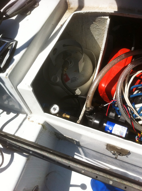 | Deck core drilled for propane heater | Propane locker in lazarette vented outside of hull | ||