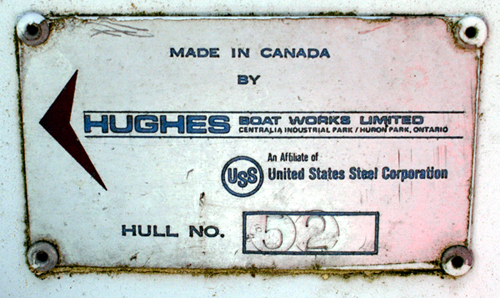 | PLATE AFT IN COCKPIT SHOWING HULL NUMBER (1969 HUGHES BECOMES PART OF US STEEL AND HOWARD AND PETER LEAVE IN 1971- THEREFORE BOAT WAS BUILT BETWEEN 1969-1971) |